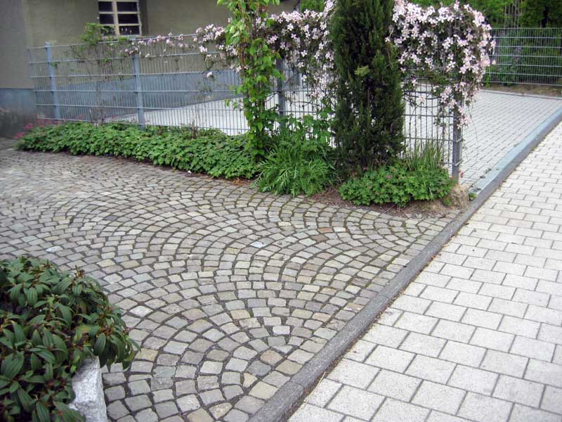 Sowohl als Einfahrt, als auch als Terrasse wird Natursteinpflaster im Garten gern verwendet. Ideal lassen sich Naturstein auch bei Rundungen und Bögen verarbeiten, weil sie nicht exakt quadratisch behauen sind und sich so Radien in fast allen Größen sauber ausarbeiten lassen.